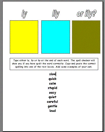 Although there are issues over using spell checkers, the main one being the predominance of American spellings, they can be a very useful tool for children to use when investigating spelling rules and patterns. Incorrect spellings are automatically highlighted by the computer and this encourages children to explore. This is particularly good way of teaching pluralisation and suffixes. In this example children are encouraged to investigate words ending in -ly, using the spell checker to come to a decision about the spelling rule. These activities can be done by small groups of children on the class computer or as a whole class in a suite. Make sure the children are familiar with the software before they try the activity.